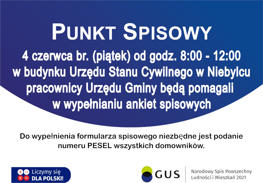 Wójt Gminy Niebylec - Gminny Komisarz Spisowy w Niebylcu informuję, że w dniu 4 czerwca br. (piątek) od godz. 8:00 - 12:00 w budynku Urzędu Stanu Cywilnego w Niebylcu zostanie uruchomiony Gminny Punkt Spisowy, w którym pracownicy Urzędu Gminy będą pomagali w wypełnianiu ankiet spisowych. Do wypełnienia formularza spisowego niezbędne jest podanie numeru PESEL wszystkich domowników.