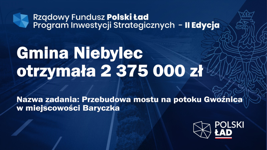 Drugie zadanie o wartości 2 375 000 zł dotyczy przebudowy mostu na potoku Gwoźnica w miejscowości Baryczka. Realizacja będzie polegać na demontażu istniejącego i budowie nowego mostu stałego na potoku. Przewidziany zakres robót w ramach zadnia obejmuje w szczególności: roboty pomiarowe, roboty przygotowawcze, roboty rozbiórkowe oraz budowę mostu stałego, a także wykonanie dojazdów do mostu stałego. Realizacja inwestycji przyczyni się do poprawy infrastruktury drogowej na terenie Gminy Niebylec.