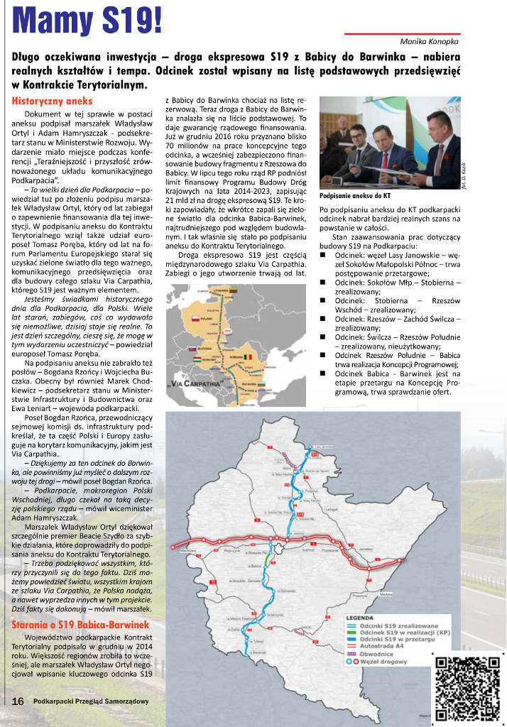 – To wielki dzień dla Podkarpacia –powiedział tuż po złożeniu podpisu marszałek Władysław Ortyl, który od lat zabiegał o zapewnienie finansowania dla tej inwestycji. W podpisaniu aneksu do Kontraktu Terytorialnego wziął także udział europoseł Tomasz Poręba, który od lat na forum Parlamentu Europejskiego starał się uzyskać zielone światło dla tego ważnego, komunikacyjnego przedsięwzięcia oraz dla budowy całego szlaku Via Carpathia, którego S19 jest ważnym elementem.