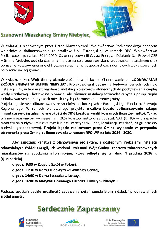 4 grudnia 2016 na terenie gminy Niebylec miały miejsce spotkania informacyjne dotyczące projektu unijnego realizowanego przy współfinansowaniu ze środków z Unii Europejskiej w ramach Regionalnego Programu Operacyjnego Województwa Podkarpackiego na lata 2014-2020, Oś priorytetowa III Czysta Energia, Działanie 3.1 Rozwój OZE. Podczas spotkań w Połomi, Gwoźnicy Górnej, Lutczy oraz Niebylcu uczestnicy zostali poinformowani o wstępnych założeniach projektu przygotowanego przez Gminę Niebylec, polegającego na budowie różnych rodzajów instalacji OZE, w tym w szczególności instalacji kolektorów słonecznych do podgrzewania ciepłej wody użytkowej i kotłów na biomasę, ale również pomp ciepła i instalacji fotowoltaicznych zlokalizowanych na budynkach mieszkalnych położonych na terenie gminy.