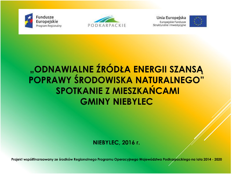 Gmina Niebylec informuje, że zamierza przystąpić do projektu unijnego realizowanego przy współfinansowaniu ze środków z Unii Europejskiej w ramach Regionalnego Programu Operacyjnego Województwa Podkarpackiego na lata 2014-2020, Oś priorytetowa III Czysta Energia, Działanie 3.1 Rozwój OZE.