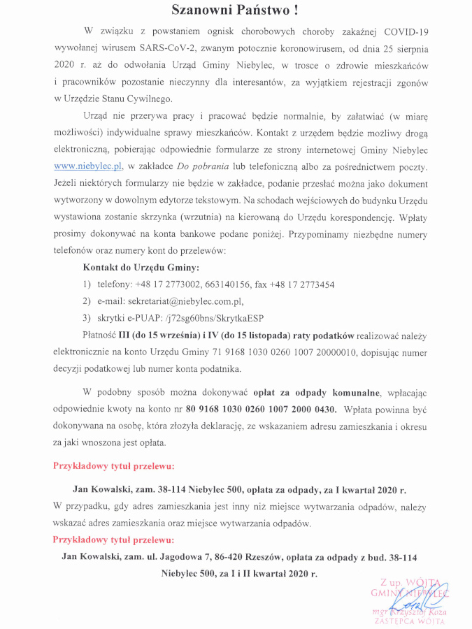 W przypadku mieszkańców Gminy Niebylec zaświadczenia wydawane będą w Gminnym Ośrodku Pomocy Społecznej w Niebylec, 38-114 Niebylec 24, tel. 17 277 30 46