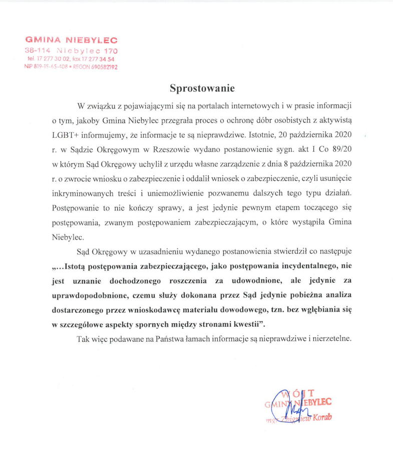 Wójt Gminy Niebylec zawiadamia, że na podstawie art. 15 zzzzzn1 ustawy z dnia 2 marca 2020 r. o szczególnych rozwiązaniach związanych z zapobieganiem, przeciwdziałaniem i zwalczaniem COVID-19, innych chorób zakaźnych oraz wywołanych nimi sytuacji kryzysowych (Dz. U. 2020.1842 z późn. zm.) z dniem 22 grudnia 2020 r. w okresie obowiązywania stanu epidemii ogłoszonego z powodu COVID-19, wstrzymuje się bieg terminów załatwiania spraw na okres 30 dni, o czym zawiadamia się strony poprzez umieszczenie niniejszego zawiadomienia w Biuletynie Informacji Publicznej Urzędu Gminy Niebylec na stronie podmiotowej, na stronie internetowej Gminy Niebylec (www.niebylec.pl) oraz na tablicy ogłoszeń w siedzibie Urzędu Gminy Niebylec.