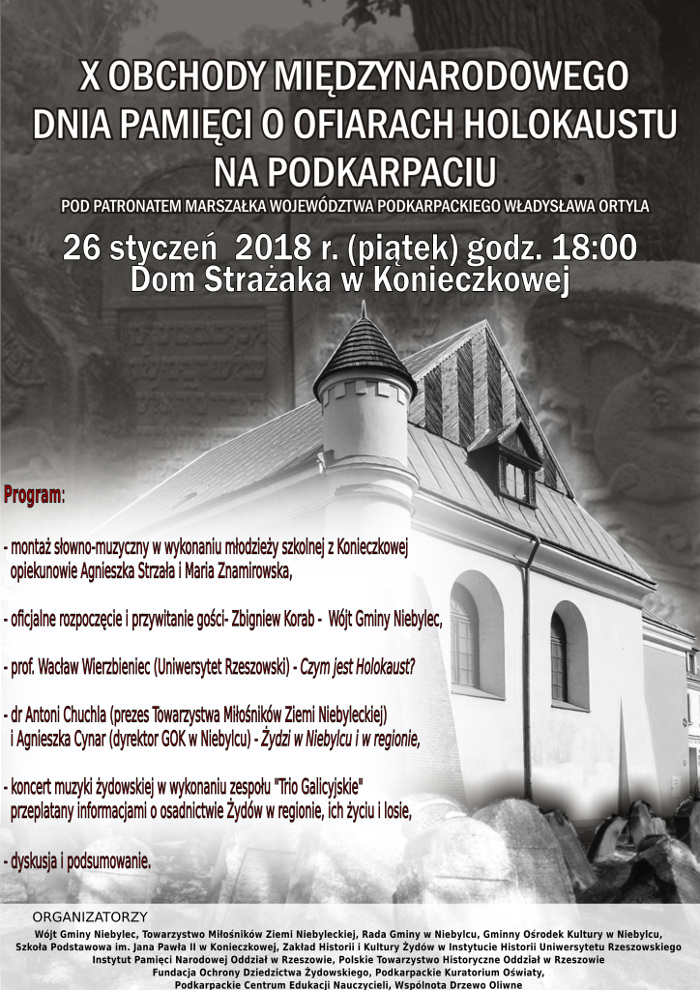 Wójt Gminy Niebylec oraz Towarzystwo Miłośników Ziemi Niebyleckiej zapraszają na X Obchody Międzynarodowego Dnia Pamięci o Ofiarach Holokaustu na Podkarpaciu, które odbędą się 26 stycznia 2018 r. o godz. 18:00 w Domu Strażaka w Konieczkowej. Szczegółowe informacje na plakacie.