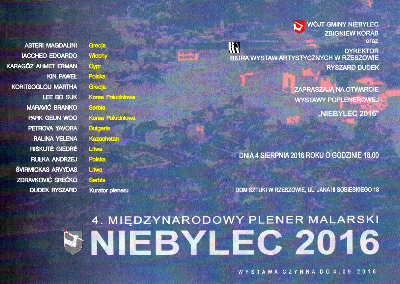 Dyrektor Biura Wystaw Artystycznych Ryszard Dudek oraz Wójt Gminy Niebylec Zbigniew Korab zapraszają na otwarcie wystawy poplenerowej 4. Międzynarodowego Pleneru Malarskiego „NIEBYLEC 2016" 4 sierpnia 2016 r. godz. 18:00 w Domu Sztuki w Rzeszowie ul. Jana III Sobieskiego 18. Wystawa będzie czynna do 4 września 2016 r.